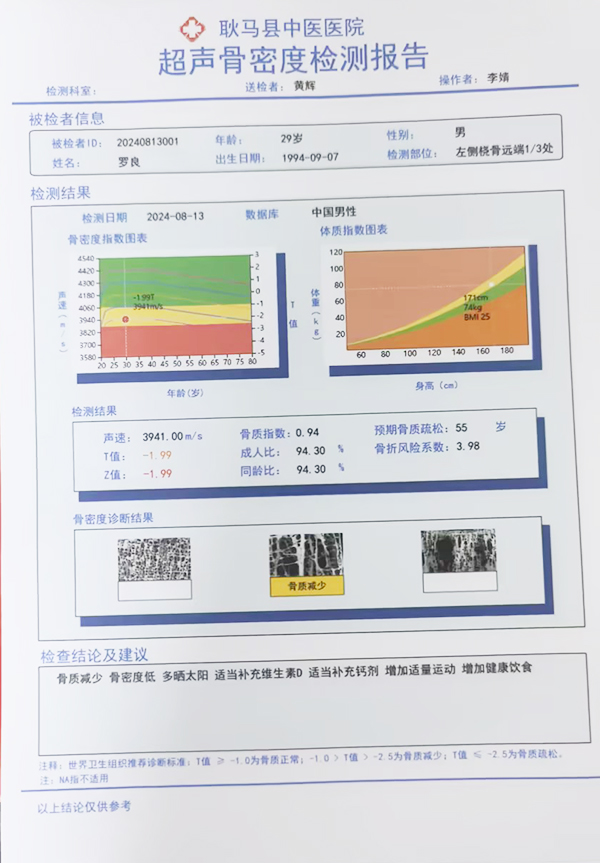 骨密度檢測(cè)是評(píng)估骨骼健康狀況的重要方法,對(duì)于早期發(fā)現(xiàn)骨質(zhì)疏松、預(yù)測(cè)骨折風(fēng)險(xiǎn)、監(jiān)測(cè)治療效果等具有重要意義。以往,患者需要前往上級(jí)醫(yī)院或?qū)I(yè)機(jī)構(gòu)進(jìn)行骨密度檢測(cè),不僅費(fèi)時(shí)費(fèi)力,還可能延誤病情。此次耿馬縣中醫(yī)醫(yī)院引進(jìn)的品源醫(yī)療超聲骨密度檢測(cè)儀,具備多部位測(cè)量(橈骨、脛骨)和多傳感器探頭的技術(shù)優(yōu)勢(shì),能夠?qū)崿F(xiàn)對(duì)不同年齡段人群的全面檢測(cè)。其內(nèi)置的少年兒童數(shù)據(jù)庫(kù)(0-12歲)、青少年數(shù)據(jù)庫(kù)(12-20歲)、成年人數(shù)據(jù)庫(kù)(20-80歲)、老年人數(shù)據(jù)庫(kù)(80-100歲),使得檢測(cè)結(jié)果更加貼合不同人群的實(shí)際情況。
